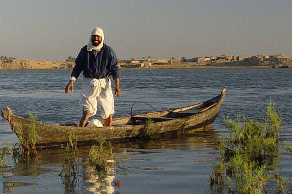 Marsh Arab boatman on the Euphrates, with part of Al Qurnah on the far bank (pic: Maj A Phipps)