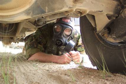 G-Day minus 1: Cpl Bowater demonstrates the protective effect of a Land Rover during a real, live Scud bom-bardment