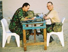 We spent the next 48 hours putting on and taking off our respirators. One soon becomes blasé about the presence of danger and although our drills were no less hurried our hearts ceased to speed up quite so much as we went about them. Part of the reason for our lack of fear was the apparent arbitrariness of the alarms. They were supposed to sound while the Scuds were five minutes away. It was quite surprising, therefore, to hear them go off about ten minutes after we had seen one slam into the ground about a kilometre from our vehicles. Occasionally, I was almost glad of the alerts as they allowed me to ‘accidentally’ knock the chess board I was playing at and so avoid yet another defeat at the hands of Tpr Ewing (on the left in the photograph above) in our ongoing desert chess tournament.